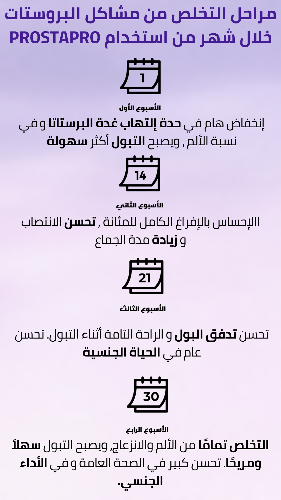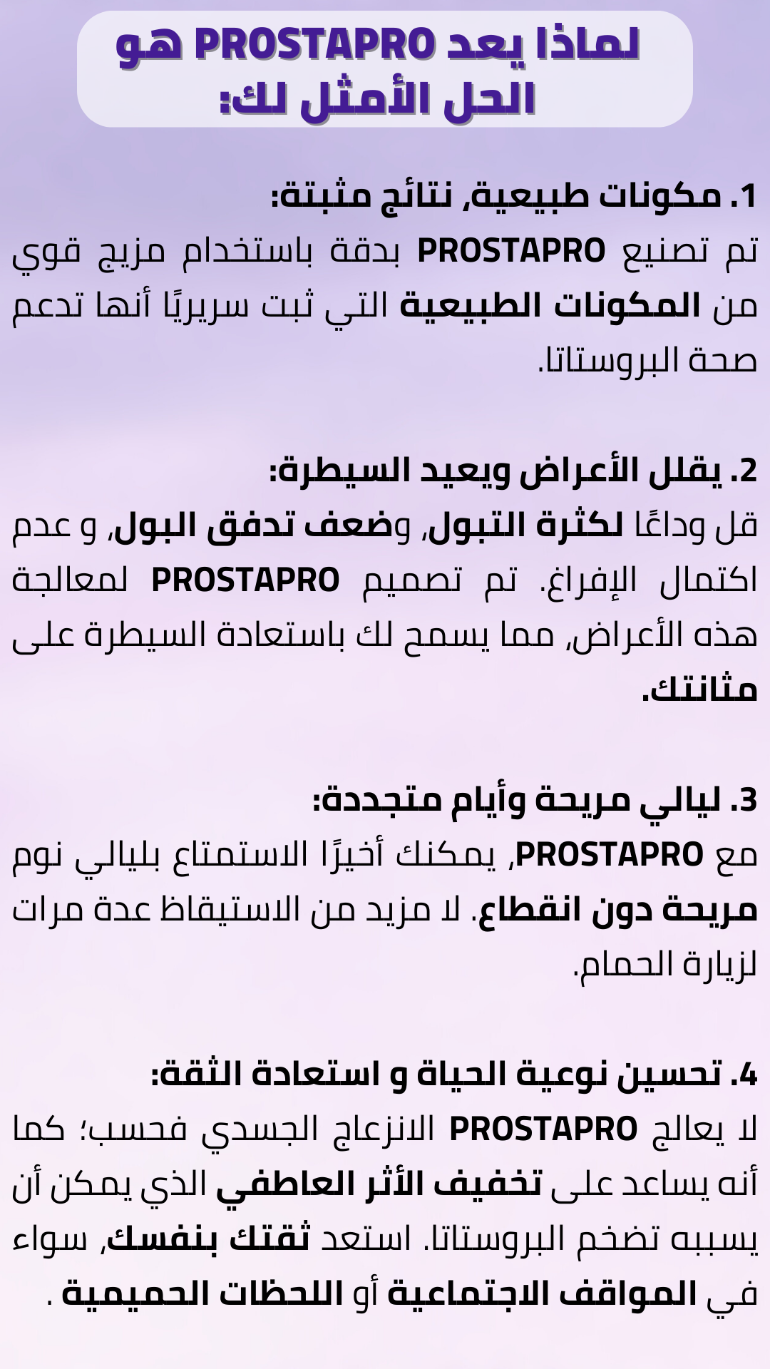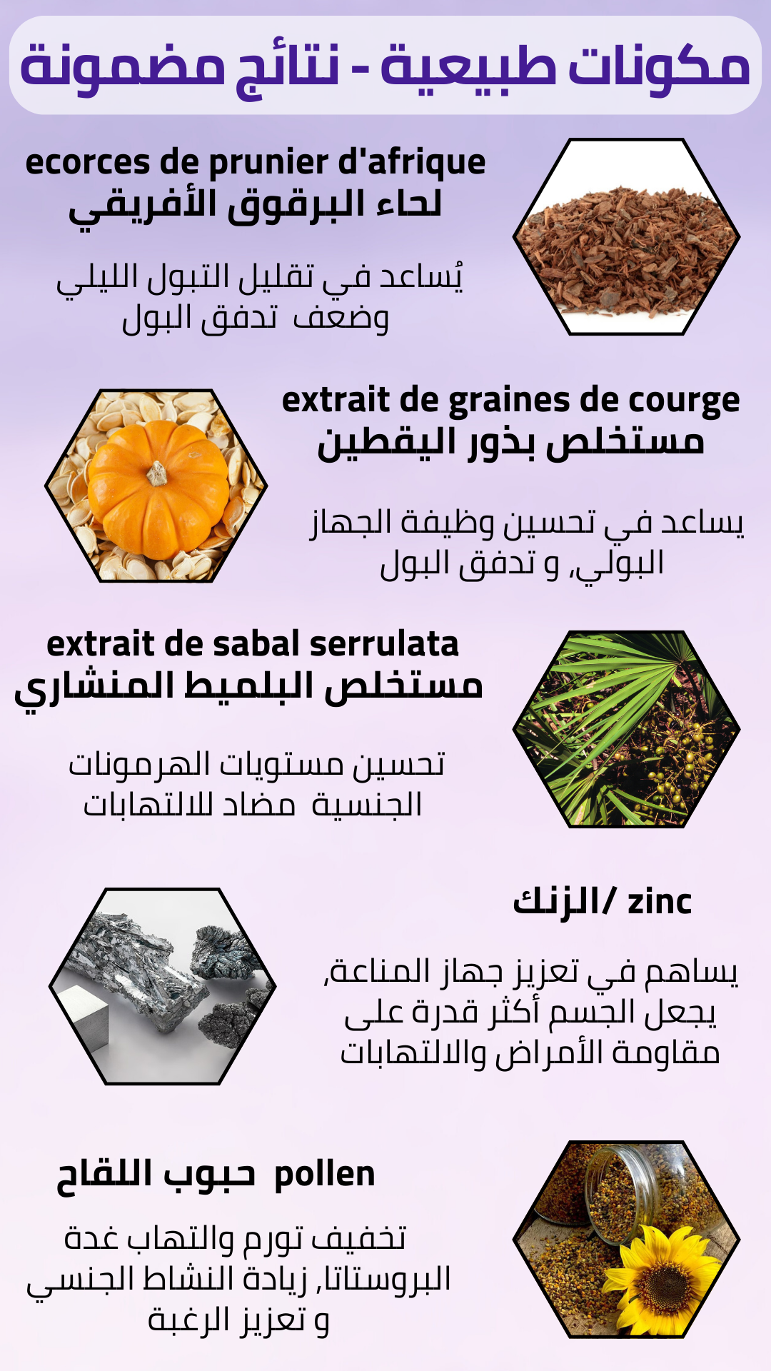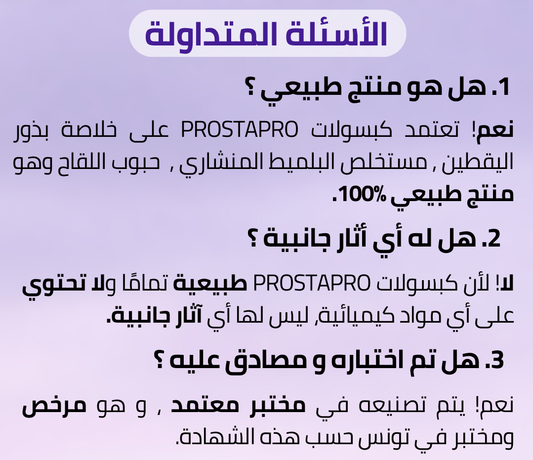 يعمل PROSTAPRO على تقوية الدورة دموية على مستوى .الحوض بفضل مكوناته العالية الجودة.